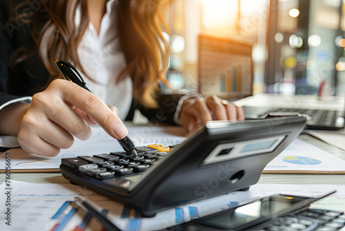 Concept of finance and accounting. Businesswoman at desk using calculator