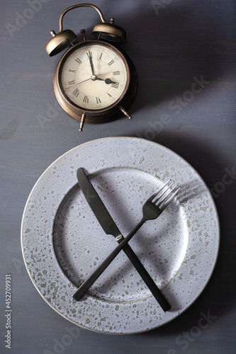 concept of intermittent fasting, ketogenic diet, weight loss. fork and knife on a plate and alarmclock
