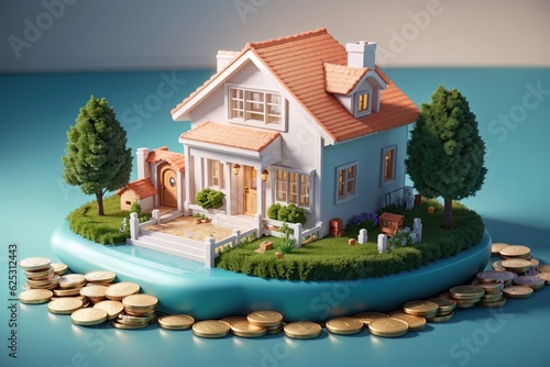 Concept of Investment property. Miniature house with plot of land on coins. Mortgage, real estate and new home. Generative AI