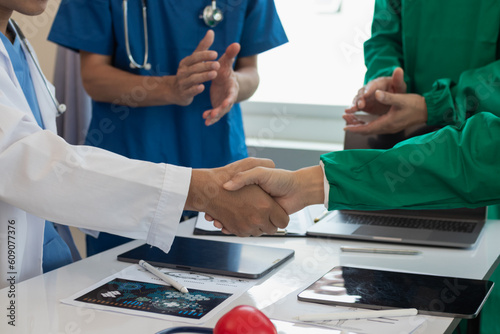 concept of mobilizing ability of medical team in conference room to diagnose and treat disease correctly. medical team joins meeting and discusses patient illness in order to treat it correctly