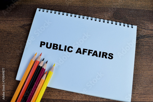 Concept of Public Affairs write on book isolated on Wooden Table.