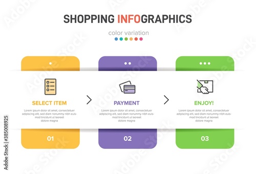 Concept of shopping process with 3 successive steps. Three colorful graphic elements. Timeline design for brochure, presentation, web site. Infographic design layout.