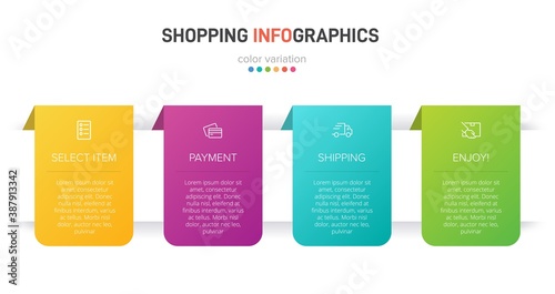 Concept of shopping process with 4 successive steps. Four colorful graphic elements. Timeline design for brochure, presentation, web site. Infographic design layout.