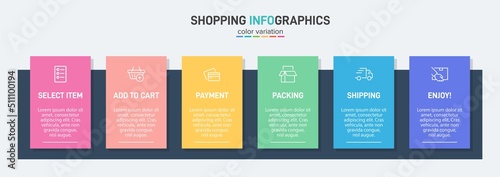 Concept of shopping process with 6 successive steps. Six colorful graphic elements. Timeline design for brochure, presentation, web site. Infographic design layout.