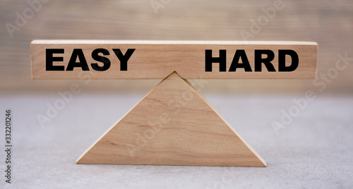 concept of the balance of words EASY win and HARD on wooden scales on a light background
