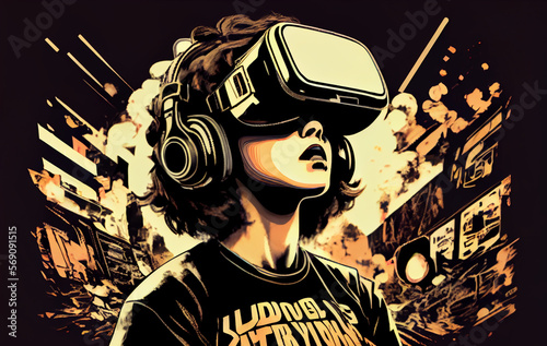 Concept of virtual reality technology, graphic of a teenage gamer wearing VR head-mounted playing game. Generative Ai.