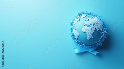 Concept of World Diabetes Day , The world is surrounded by a blue ribbon pin , free space on the left side , on blue background , illustration , generative ai