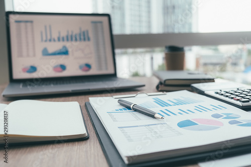 Concept of young business working at his coffee shop and using laptop, holding smartphone in hand discussing the charts and graphs showing the results of their successful teamwork.