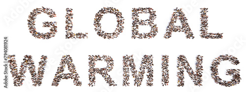 Concept or conceptual large community of people forming GLOBAL WARMING messag. 3d illustration metaphor for climate change, toxic emission, smog, pollution, drought, ecology and conservation