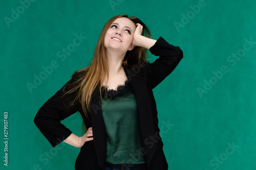 Concept portrait for a belt of a pretty girl, young woman with beautiful brown hair and in a black jacket and green T-shirt on a green background. In the studio in different poses showing emotions.