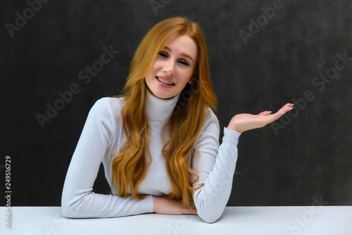 Concept portrait of a nice beautiful red-haired girl talking on a gray background in the studio sitting at the table.