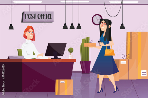 Concept Post office with people scene in the background cartoon design. Woman carries a box with a gift to the post office to be sent to the right address. Vector illustration.
