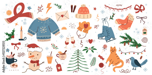 concept winter, pattern, Fir tree, stars, dots, snow, line drawing. Holiday design elements are isolated on white background. Simple shape conceptfor winter season cards, for party poster, banner