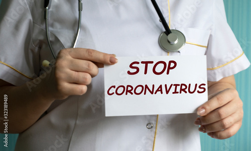 concept words stop coronavirus in the hands of a doctor