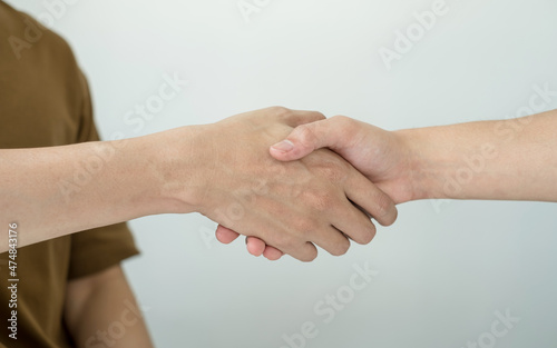 Concept work from home. Two business leaders talk about charts, financial graphs showing results are analyzing and calculating planning strategies, business success building processes, and shake hand