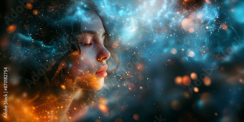 Conceptual art piece of a woman's head,entwined with colorful smoke trails, reality and fantasy.