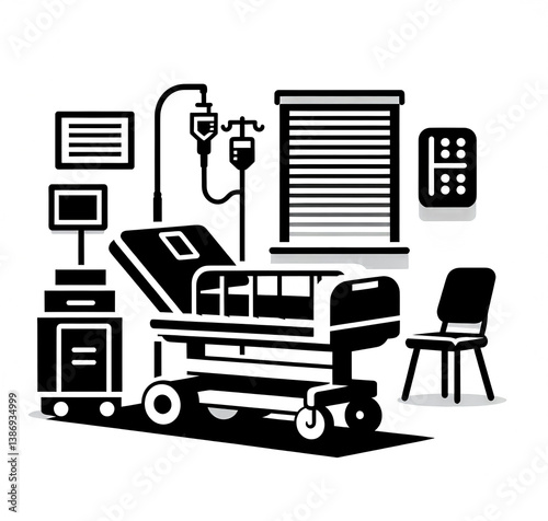 Conceptual black and white vector illustration of a patient recovery room with special assistance equipment in a hospital on a white background.