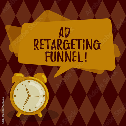 Conceptual hand writing showing Ad Retargeting Funnel. Business photo showcasing Aiming relevant ads to those have visited your website Rectangular Speech Bubble Overlay and Analog Alarm Clock