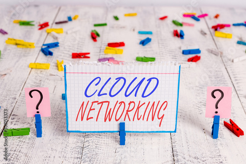 Conceptual hand writing showing Cloud Networking. Concept meaning sourcing and utilization of one or more network resources Crumbling sheet with paper clips placed on the wooden table