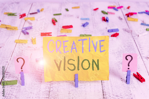 Conceptual hand writing showing Creative Vision. Concept meaning process of purposefully generating visual mental imagery Crumbling sheet with paper clips placed on the wooden table