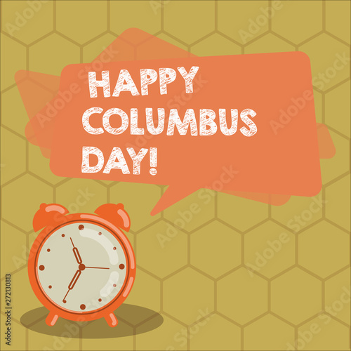 Conceptual hand writing showing Happy Columbus Day. Business photo text holiday commemorates landing of Christopher in Americas Rectangular Speech Bubble Overlay and Analog Alarm Clock