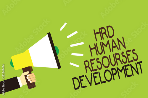 Conceptual hand writing showing Hrd Human Resources Development. Business photo showcasing helping employees develop personal skills Man holding megaphone green background message speaking loud
