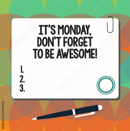 Conceptual hand writing showing It S Is Monday Don T Forget To Be Awesome. Business photo showcasing First day of the week Happiness Square Color Board with Magnet Click Ballpoint Pen and Clip