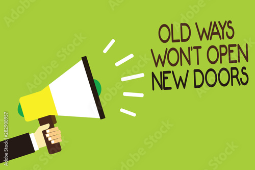 Conceptual hand writing showing Old Ways Won t not Open New Doors. Business photo showcasing be different and unique to Achieve goals Man holding megaphone green background message speaking loud