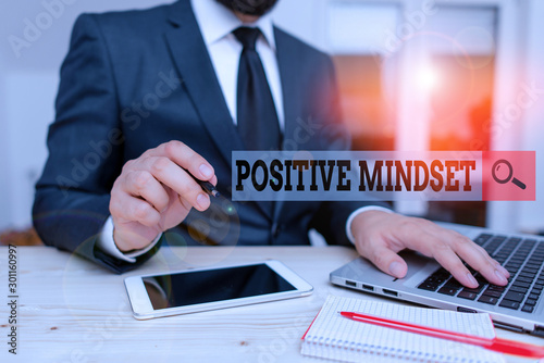 Conceptual hand writing showing Positive Mindset. Concept meaning mental attitude in wich you expect favorable results Male human wear formal clothes present use hitech smartphone