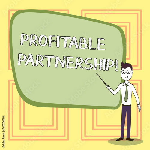 Conceptual hand writing showing Profitable Partnership. Concept meaning Creating an environment for mutual growth and success Confident Man in Tie, Eyeglasses and Stick Pointing to Board