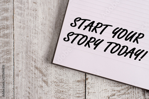 Conceptual hand writing showing Start Your Story Today. Concept meaning work hard on yourself and begin from this moment Notebook stationary placed above classic wooden backdrop