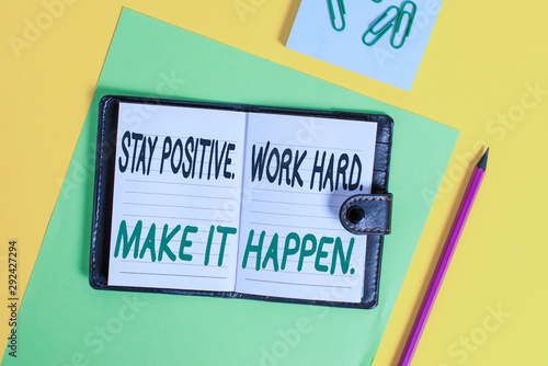 Conceptual hand writing showing Stay Positive Work Hard Make It Happen. Concept meaning Inspiration Motivation Attitude Locked diary striped sheets clips notepad colored background