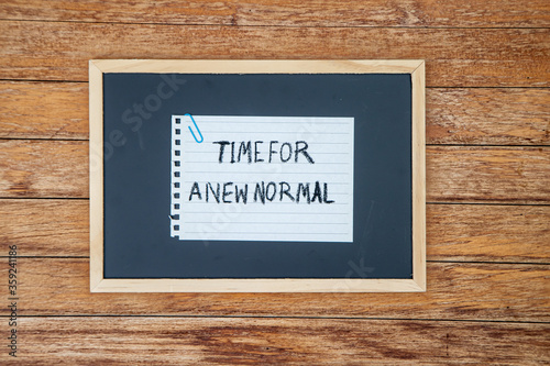 Conceptual hand writing showing Time For A New Normal, on white paperclip hold written chalkboard on wooden deck.