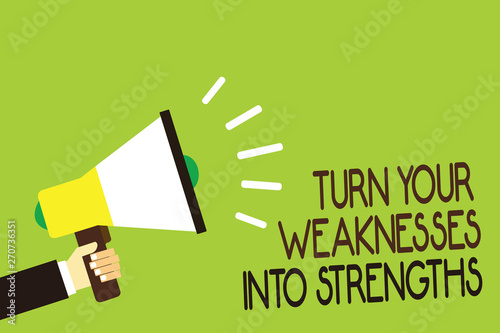 Conceptual hand writing showing Turn Your Weaknesses Into Strengths. Business photo showcasing work on your defects to get raid of them Man holding megaphone green background message speaking loud