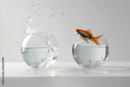 Conceptual image of a goldfish jumping between two bowls. Modern minimalist style. Perfect for creative and inspiring ideas or motivational concepts. Generative AI