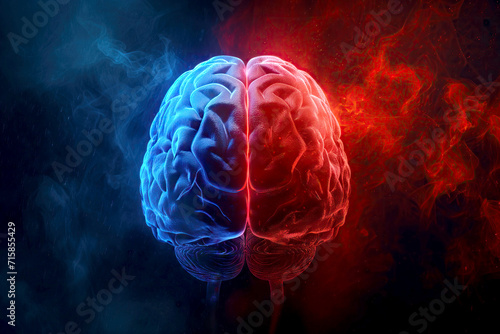 Conceptual Image of a Human Brain with Blue and Red light Representing Logic and Creativity
