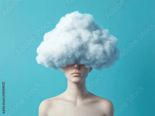 conceptual image of mannequin with cloud shaped head against serene blue background, symbolizing creative thinking