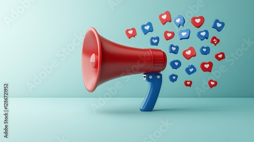 Conceptual image with a red megaphone with blue and red 'like' icons coming out, symbolizing social media promotion and content popularity