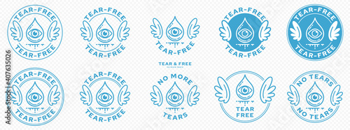 Conceptual marks for product packaging. Marking - no tears. The brand with wings is a symbol of the not containing, free. Teardrop icon with eye and flowing line. Vector
