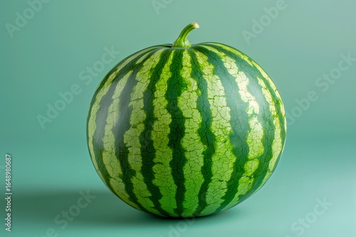 Conceptual minimalist still life of uncut green watermelon on green background. Total green, Summer fruit.
