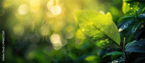 Conceptual nature view of a green leaf against a blurred greenery background in a garden illuminated by sunlight with copy space serving as a backdrop for a natural green plants landscape ecology and