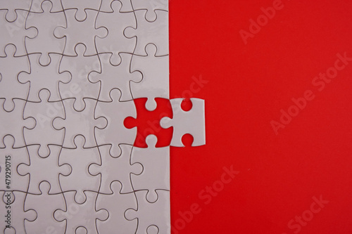 Conceptual photo of copyspace red background missing jigsaw puzzle. Image for motivation, inspiration and consultation, ideation concept