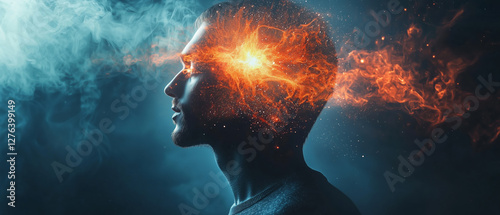 Conceptual portrait of a man with a vivid explosion of thoughts symbolizing creativity and imagination in a surreal atmosphere