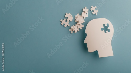 Conceptual representation of mental health with a paper cut head and missing puzzle piece on a serene blue background