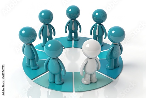 Conceptual Team Synergy: Seven stylized figures represent diverse individuals converging in a circle around a central figure, symbolizing unity, collaboration.