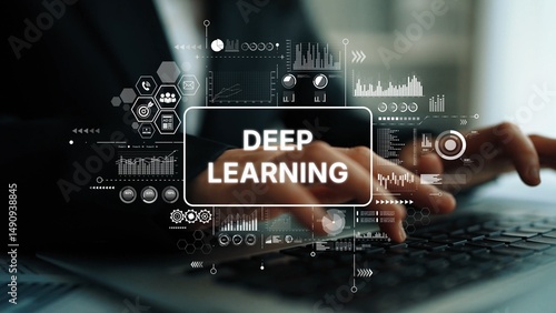 Conceptual visualization of deep learning technology with data analytics and graphs on a laptop screen. Asymptotic smart data analytic.