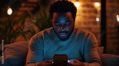 Concerned Young Black Man Reading Text Message on Smartphone Sitting on Couch at Home