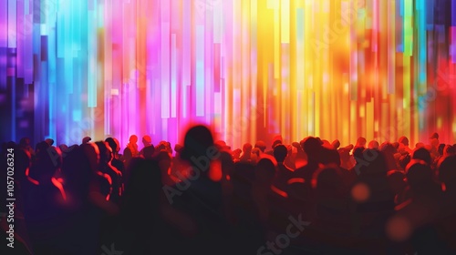 Concert crowd silhouetted against a colorful stage backdrop ,close-up