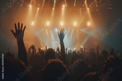 concert crowd with hands in the air, surrounded by vibrant stage lights and band playing live music