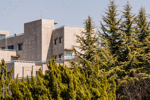 Concrete building, evergreen trees